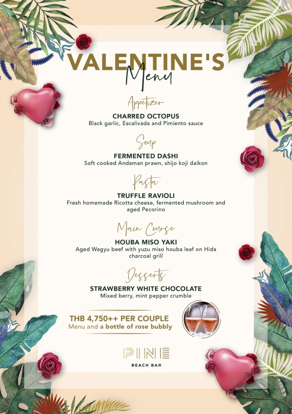 Pine Beach Bar is offering a special Valentine's menu on Sunday, 14 February for all day dining from 11.00 - midnight.
