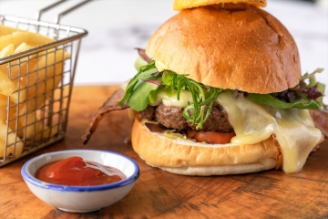 Beef patty with tomato, lettuce, bacon, onion and cheddar cheese served with french fries.