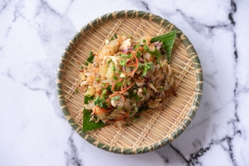 Pomelo, dried coconut, crispy shallot, coriander, spring onion, boiled egg, chicken and shrimp.