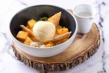 Mango served with sweet sticky rice, salted coconut milk and sesame seeds.