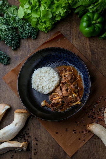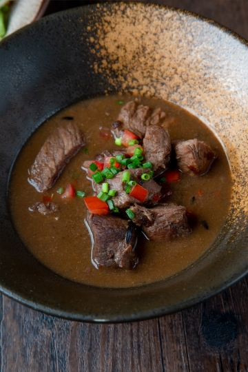 Put the same frying pan back on the stove on a medium heat and deglaze the pan with the Leffe Bruin (Belgian beer), and let it absorb all the flavours of the sautéed shallots, white onions and beef. While it is simmering add it to the beef.