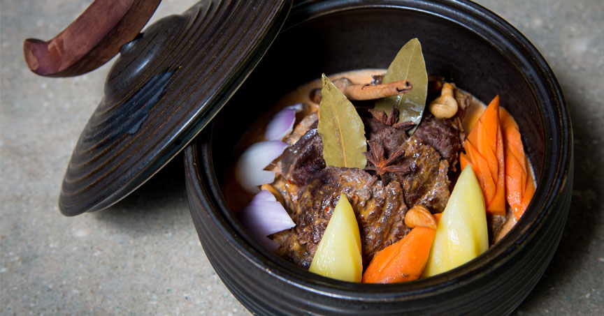 For the main course, we both opt for traditional Thai curries. My friend’s choice – predictably since she hails from Trang – is Kua Gling, finely minced southern kurabuta pork, stir-fried in curry paste with lemon grass and kaffir lime. My selection is a Panang fish curry, Pla Grapong Dang, with snapper and cumin. The real deal, with a rich red sauce and moist fillets of fish. Choice of three kinds of rice too….And, for those who cannot make up their minds, the Curry Platter offers a selection of five different classics including Gang Keaw Waan (green curry) and Masssaman Nua. There is even a selection of vegetarian dishes based on Phuket’s own traditions.