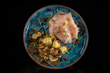 We start with Crudo di pesce spada e caponata croccante, a delicious Mediterranean course of sword fish carpaccio and a warm medley of crispy summer vegetables, capers and caper leaves. The fried vegetables are a delight and pair perfectly with the fish.