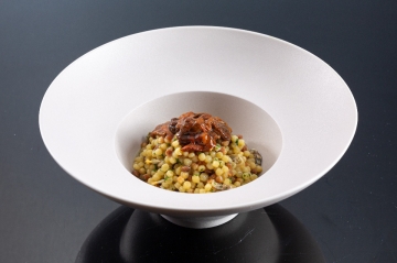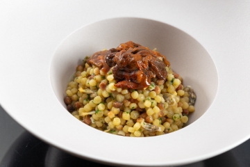 Next, we dig into a Sardinian pasta dish called Fregola risottata alle arselle con polpa di riccio – wood roasted fregola pasta cooked in wedge clams’ broth with Mediterranean herbs and finished with sea urchin roe. This is an exquisite dish; the pasta is light, and the sauce is incredibly creamy.